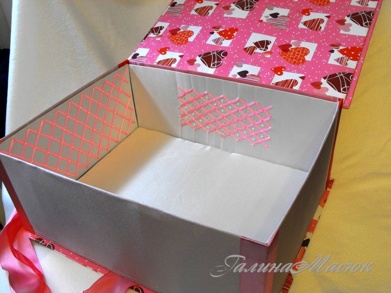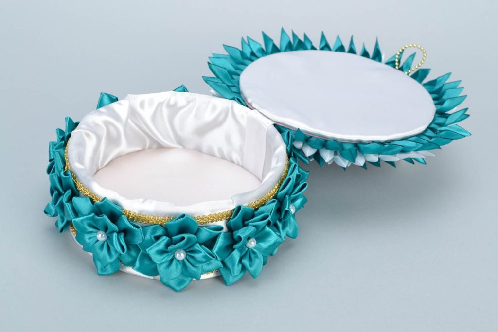 - Хорошо стяните атласную ленточку и приклейте её внутрь дна шкатулки.