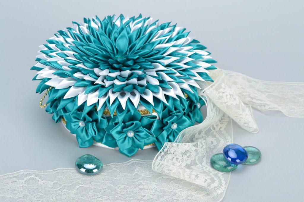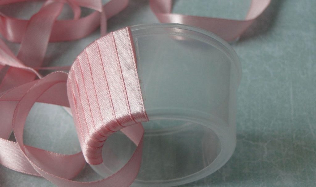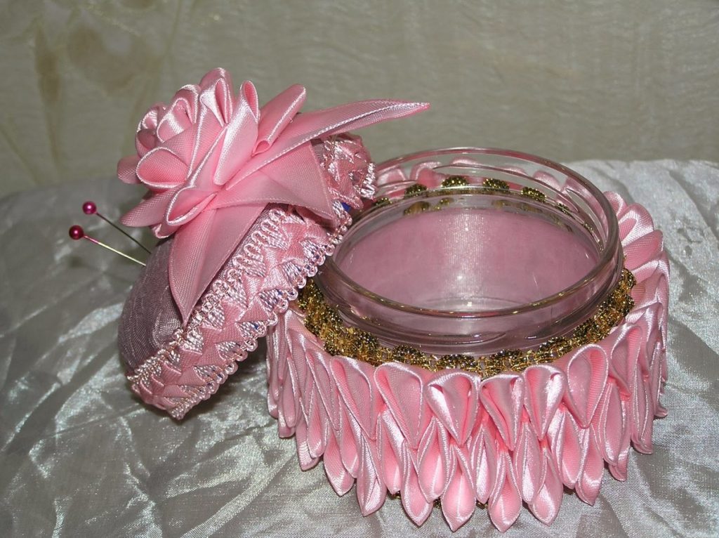 - Стяните ниткой атласную ленточку и приклейте её к нижней части шкатулки. Таким образом, сделайте всю юбку, чередуя атласные ленты и кружево.