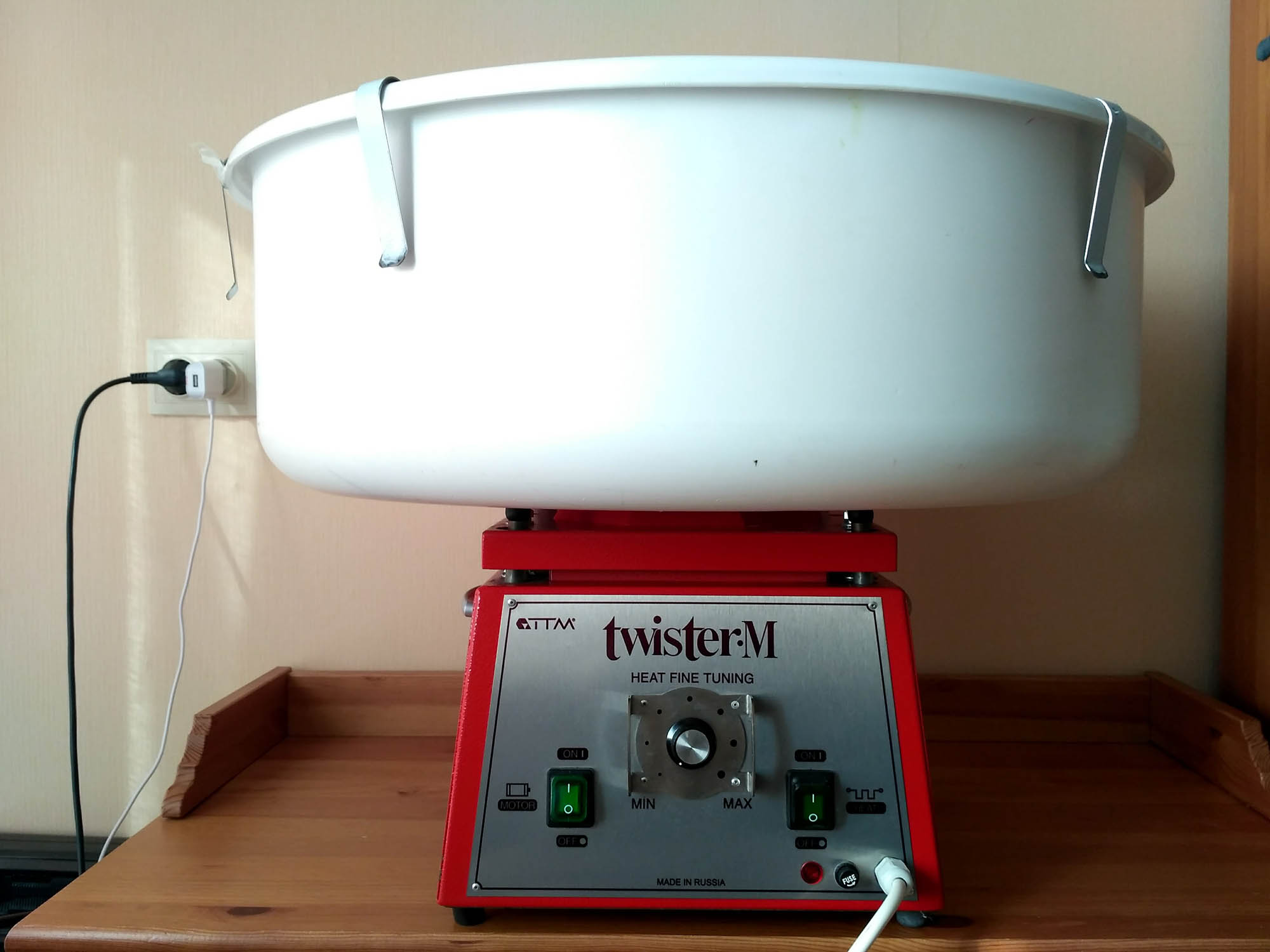 Тэн нагревается, сладкий песок расплавляется. От вращения примерно через минуту образуются белые паутинки. Берем любую палочку, например, для роллов, и пытаемся поймать нити в горизонтальном положении, чтобы моток не упал.
