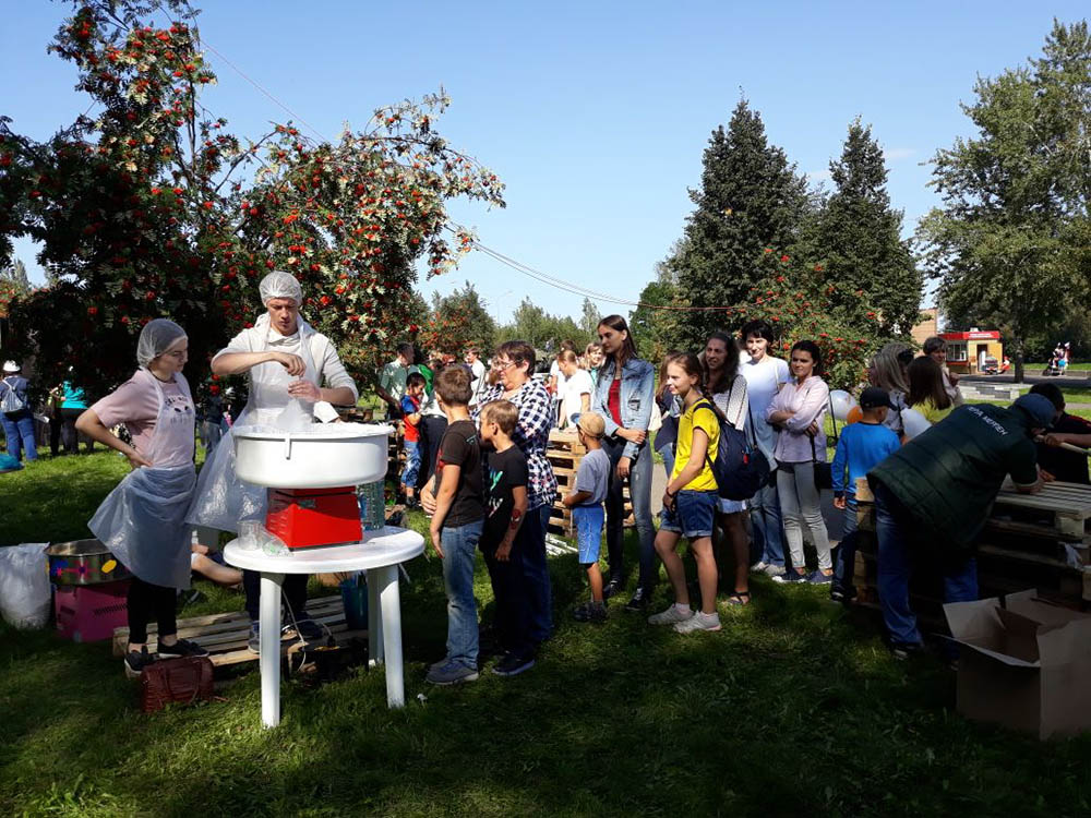 На детском празднике помогаю промоутеру разобраться с аппаратом. Слева в углу розовый китайский аппарат для ваты, брал в аренду как второй аппарат. Он сломался прямо на выезде