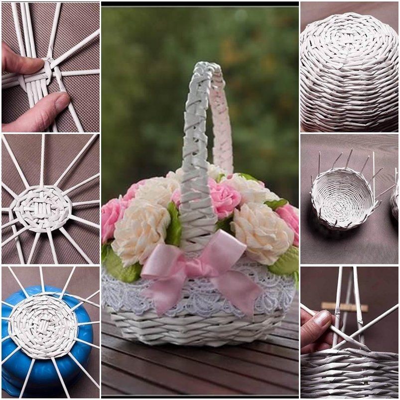 Для ручек необходимо взять две трубочки и переплести их, постоянно смазывая клеем для наилучшего схватывания. Концы ручек необходимо приклеить к основанию корзинки.