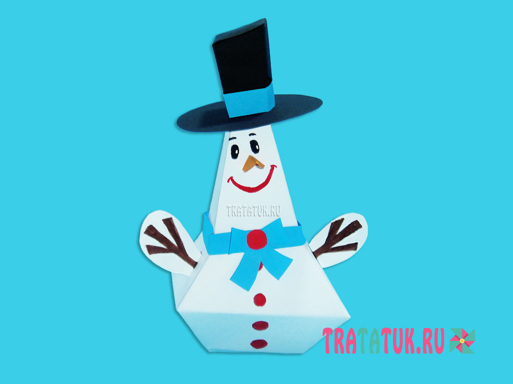 Такая поделка и украшение, и упаковка подарка. Внутрь можно поместить сладости, миниатюрный подарок (колечко). Делают его из картона или формиама — похож на прорезинненый картон, плотный и податливый. Вырежьте нужную форму туловища и шапки, как показано на рисунке. Скрепите ее сверху степлером или клеем.