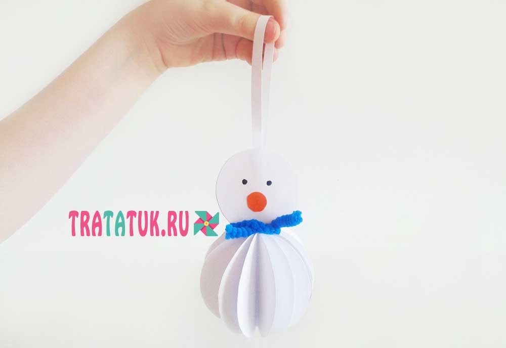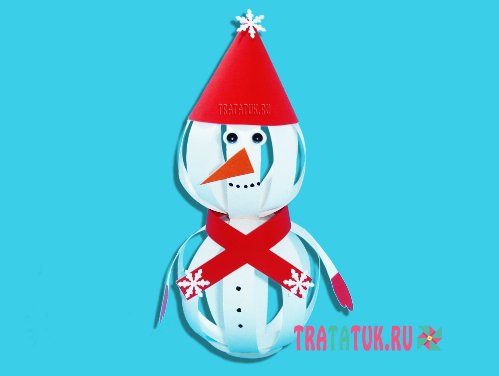 Отличным новогодним украшением на елку является объемный снеговик из бумаги. Он красивый, забавный, ребенку понравиться его мастерить, а затем играть и с гордостью демонстрировать всем гостям. Сама работа очень легкая, особенно, если есть специальный компостер, с помощью которого можно быстро вырезать много кругов. Но и без него ничего сложного нет, так как поделка эта из бумаги, а не из картона, ее можно сложить в несколько слоев и сразу вырезать много кружочков.