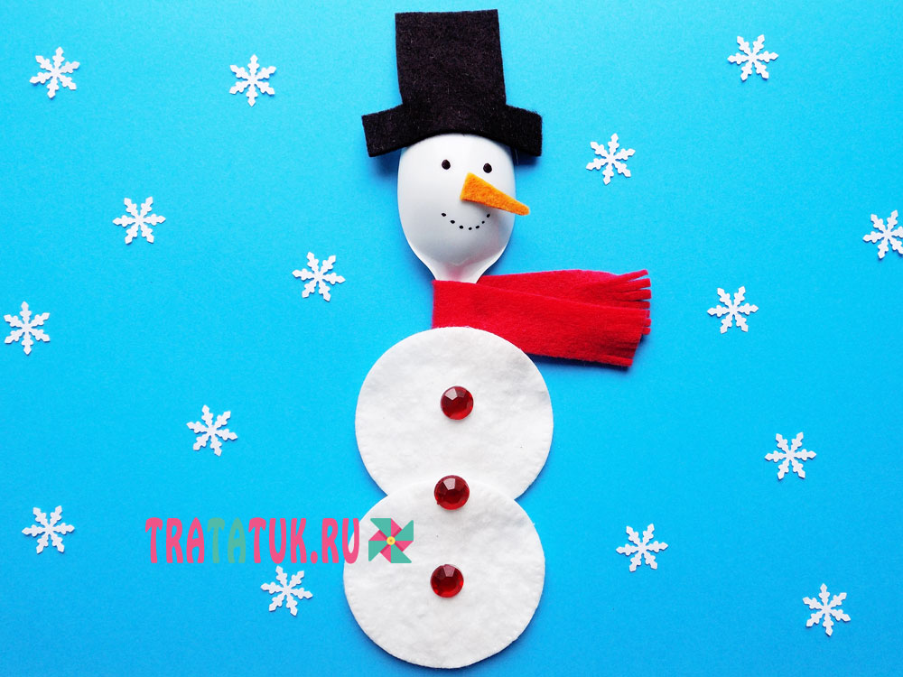 Еще одна идея создания снеговика из пластиковой посуды. на этот раз — это обыкновенная белая ложечка. Она является основой снеговика, где голова уже готова, осталось приклеить глаза, нос, нарисовать улыбку. Туловище же состоит из ватных дисков.
