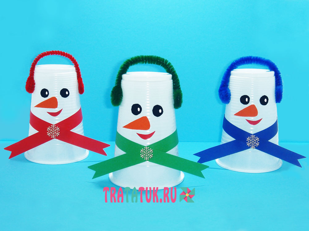 Снеговик из пластикового стаканчика – отличная и легкая новогодняя поделка из бросового материала. Конечно, большой снеговик из двух сотен стаканчиков смотрится впечатляюще, но детям такая конструкция не по силам. А вот оформить снеговичка из одного стаканчика они вполне смогут. Более того, работа настолько легкая, что за одно занятие можно сделать целое семейство таких снеговиков.