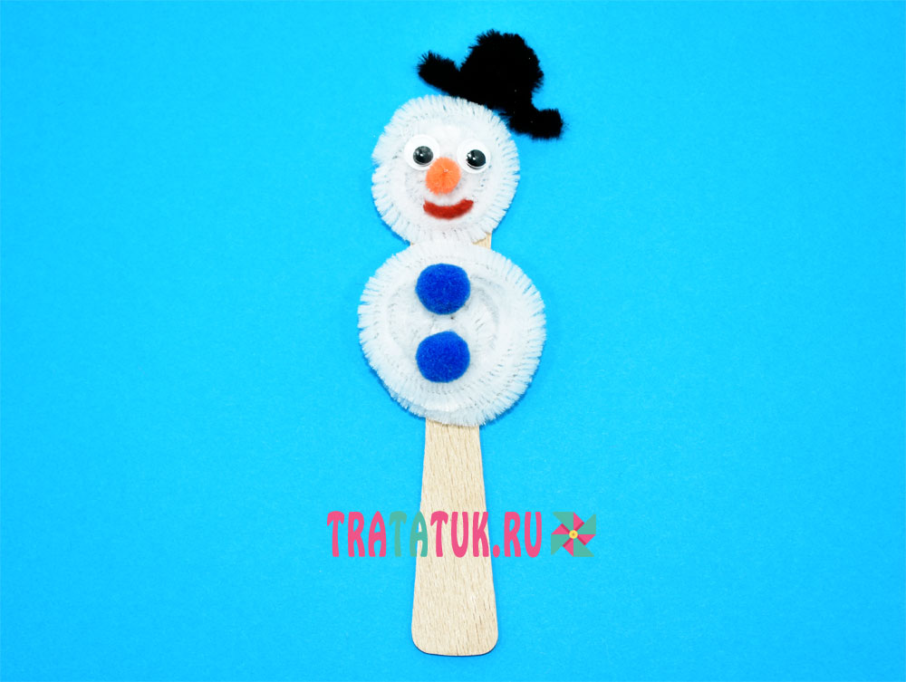 Простой снеговик из синельной проволоки на палочке от мороженого. Простая поделка для детей, вариант творческой деятельности на зимнюю тематику.