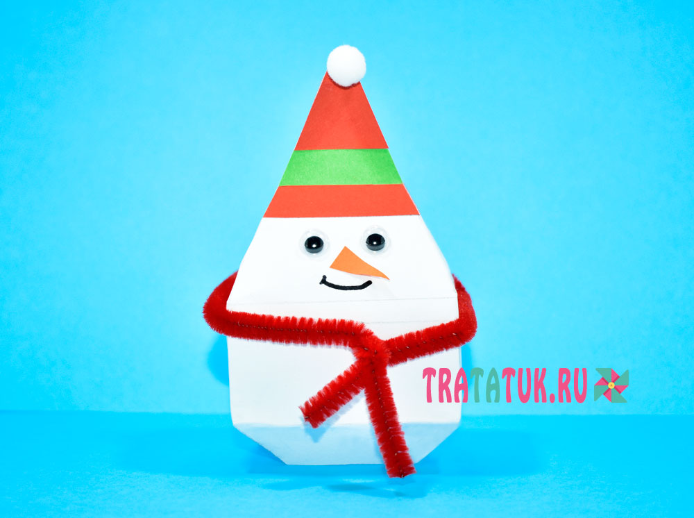 - Наденьте на снеговика шарфик и шапочку из красного фетра. Все готово!