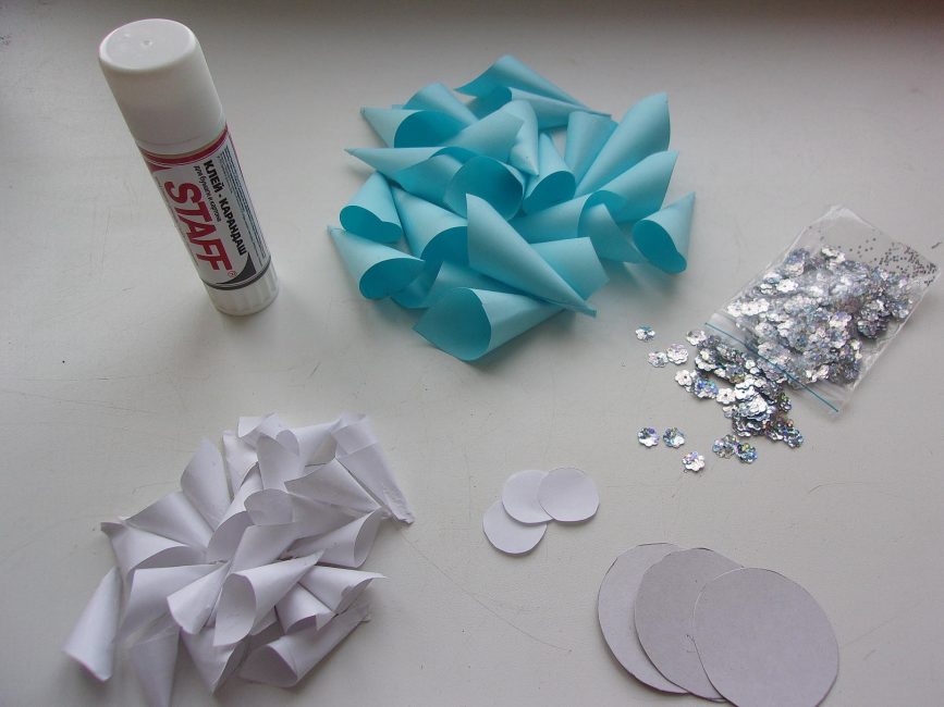 - сделайте кружок, при помощи клея приклейте полученные конвертики к нему. Для бумажной снежинки достаточно семи конвертиков;