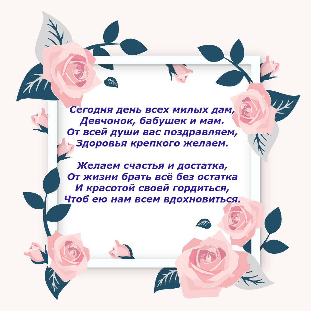 Маму, бабушку, сестренок И, конечно, всех девчонок От души мы поздравляем, Счастья, радости желаем.