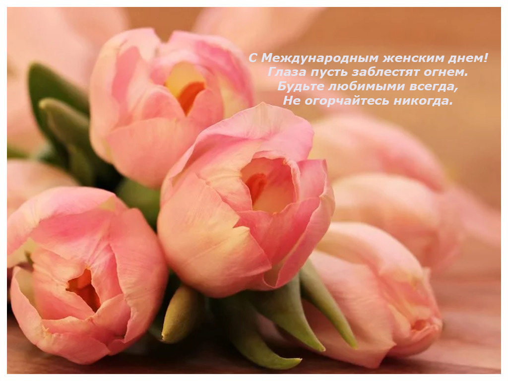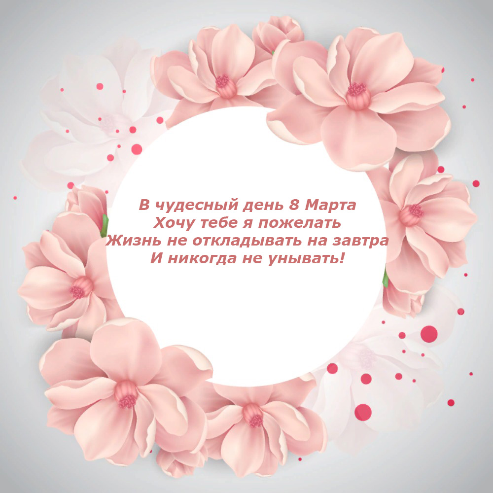 Бабушки, мамы, сестрички, С праздником марта весенним. Пусть озаряют улыбки, Будет всегда настроение!