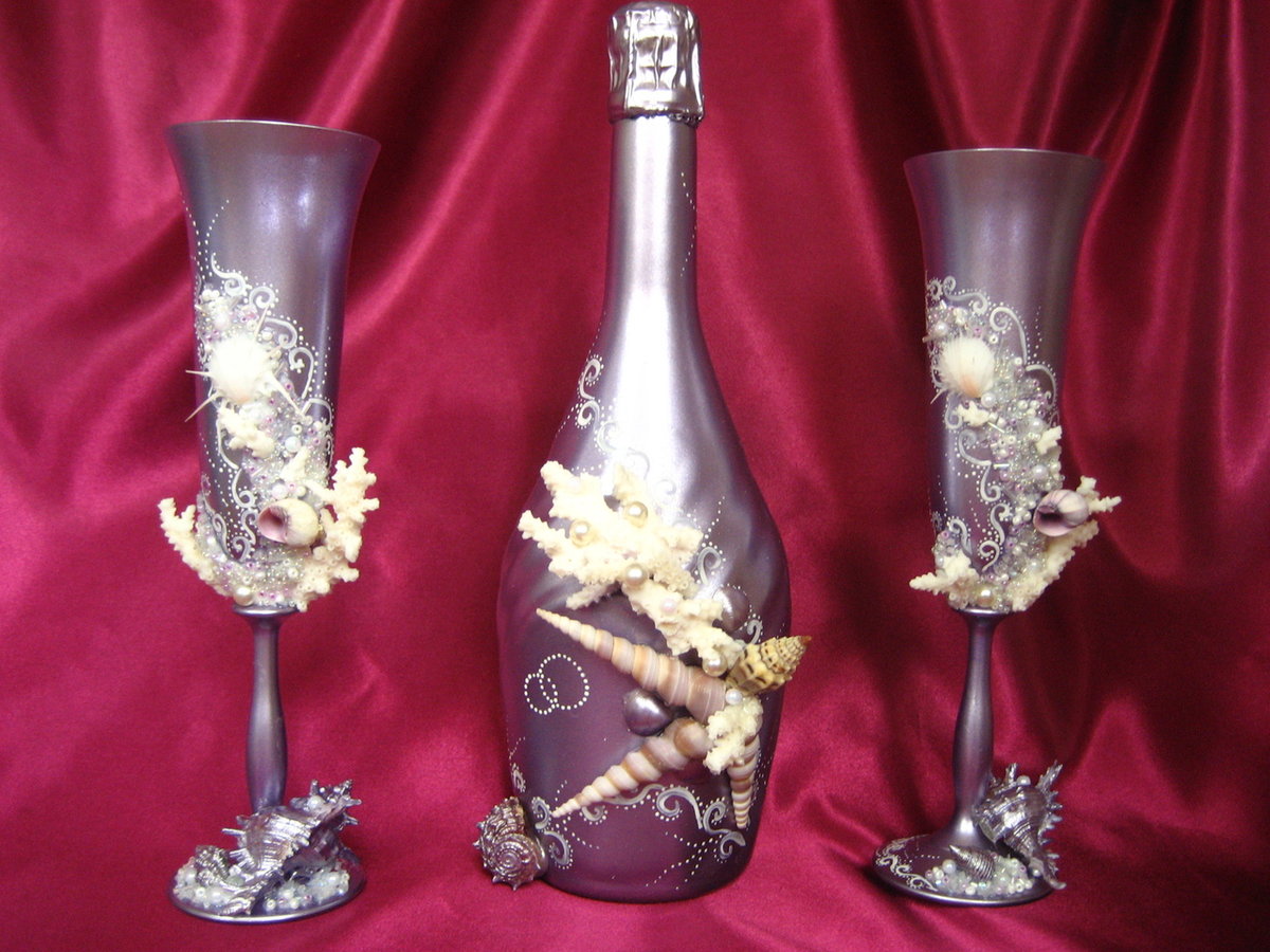 Для этого, чтобы долго не думать, можно посмотреть фото украшения бутылок на свадьбу в интернете. Можно как выбрать подходящий дизайн, так и на основание чужих идей придумать что-то своё.