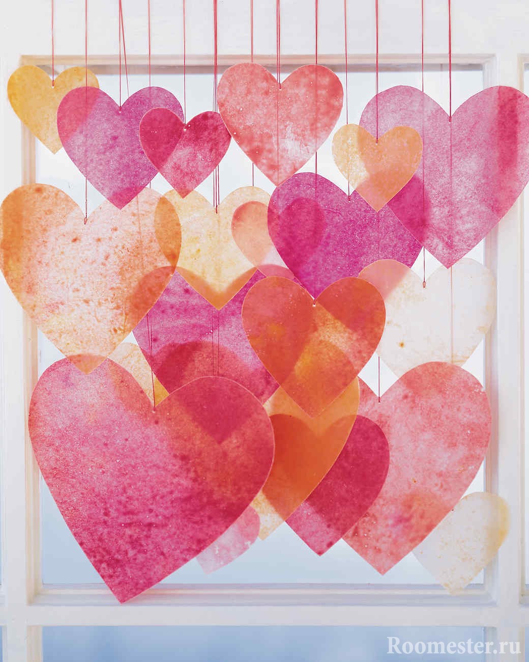 Обмотайте пяльца тканевыми полосками любого понравившегося вам цвета. Привяжите к ним несколько отрезков лески, предварительно необходимо зацепить поочередно бусины и сердечки из бумаги. Подвесная конструкция легко крепится, изготовление не требует много времени, а также она станет прекрасным украшением.