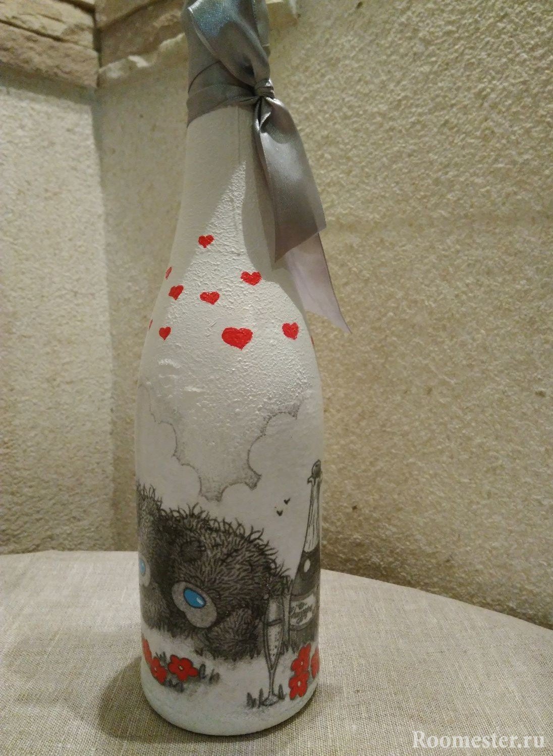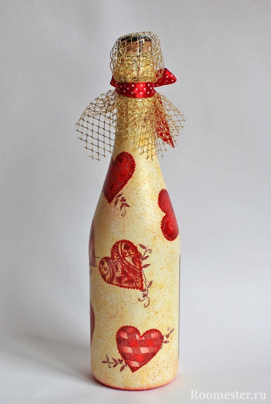 Сделайте изящные подсвечники из пустых бутылок и расставьте по всему периметру комнаты. Украсьте вышеописанным способом. Материал для украшения выберете сами, руководствуясь личными предпочтениями.