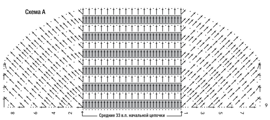 После цепочки из 33 воздушных петель следуют чередующиеся ряды из столбиков с накидом и таких же столбиков, разбавленных через один воздушными петлями