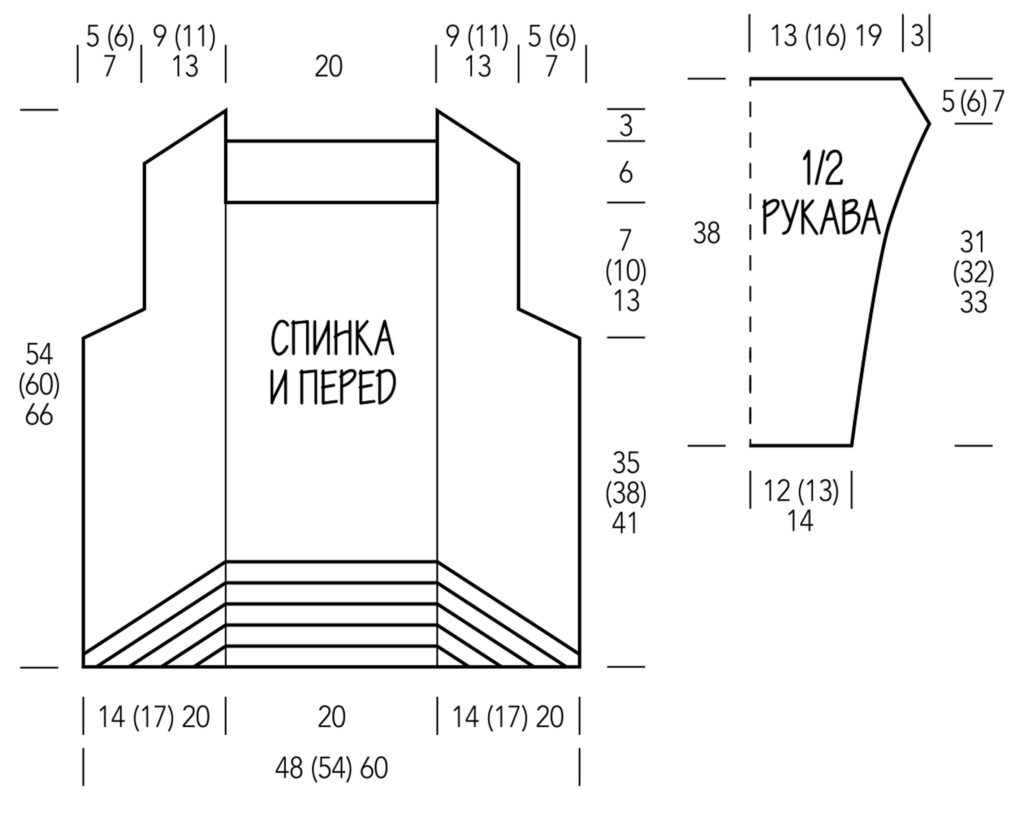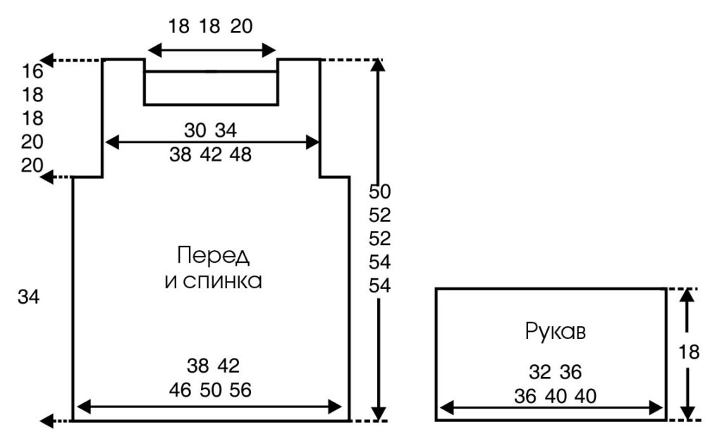 Резинку можно делать широкой или узкой, однако опытные вязальщицы рекомендуют вывязывать её не менее 3—4 сантиметра высотой. После того как резинка провязана, следует закрыть петли по рисунку, сменить инструмент на крючок и вязать полотно основным узором по схеме ниже. Для спинки через 23 сантиметра от резинки для пройм с обеих сторон нужно закрыть по 8 петель и вязать прямое полотно. Через 7 сантиметров от закрытых петель закрыть 6 петель по центру для горловины и вязать разделившиеся полотна отдельно. При достижении высоты в 40 сантиметров закончить вязание спинки.