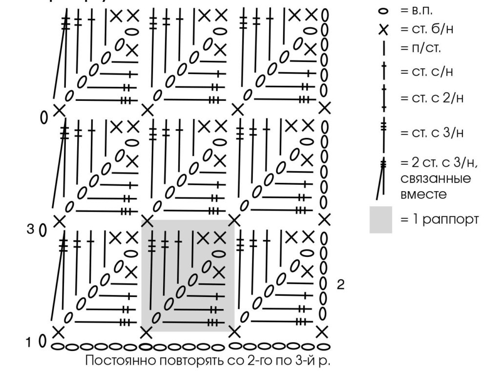 Эта модель предполагает уже более сложную вязку, с использованием столбиков с одним, двумя, тремя накидами в соответствии со схемой.
