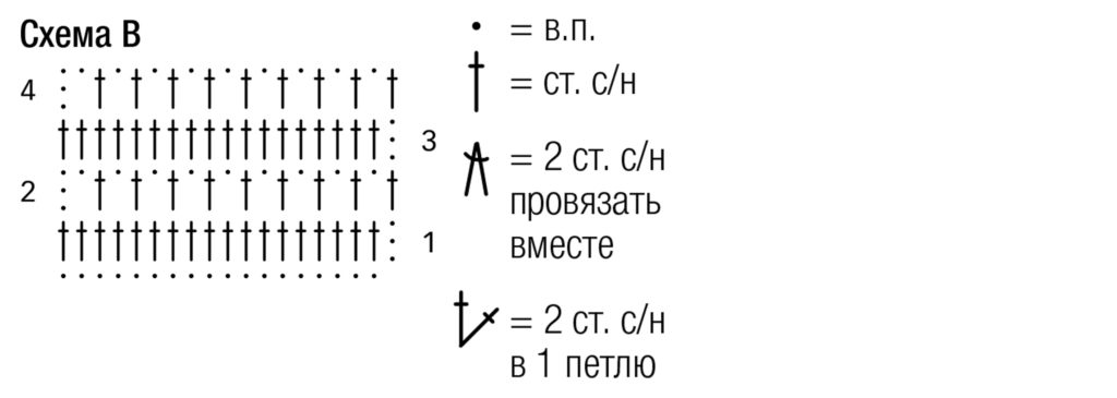 Начать вязание необходимо со спинки и переда, по схеме А. После цепочки из 33 воздушных петель следуют чередующиеся ряды из столбиков с накидом и таких же столбиков, разбавленных через один воздушными петлями.