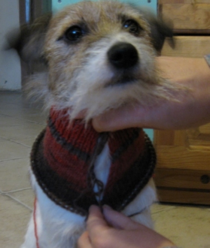 Таким образом, край свитера немного стянется, и он будет плотнее прилегать к телу животного6. Остается только обрезать и спрятать нитки и скорее примерять.