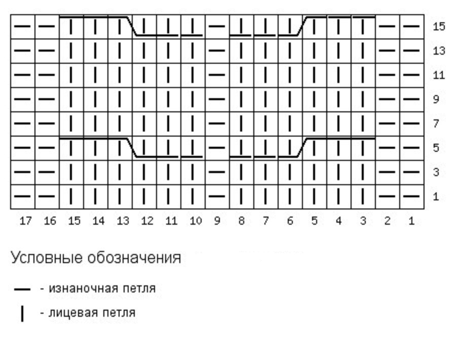 Основную часть свитера свяжем простой лицевой гладью. По спинке можно пустить узор в виде косички. Узор будем вязать на 17 петлях. По окончанию воротничка нужно отсчитать это количество петель посередине и вывязывать узор по схеме ниже. Если вам еще трудно даются узоры, можно связать весь свитер гладью.
