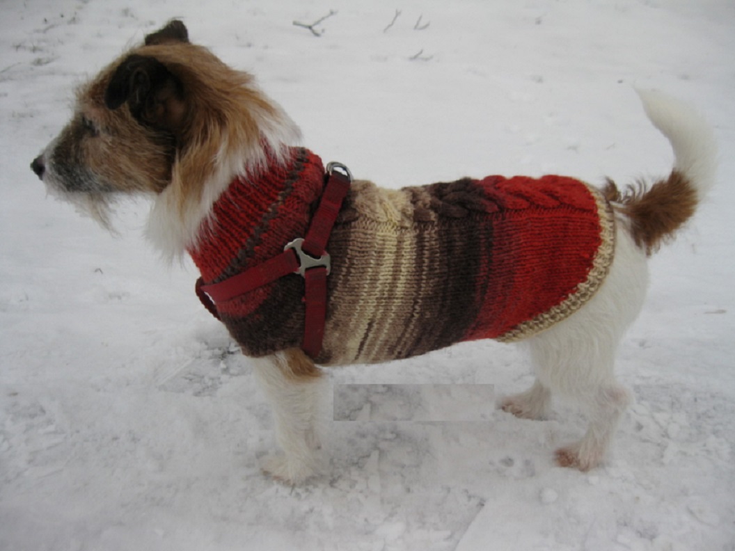 Очень хорошо смотрится кофточка с аранами. Но для свитера собачки не стоит делать араны на рукавах и передней полочке. Всё это будет только мешать питомцу. Достаточно украсить аранами только спинку.