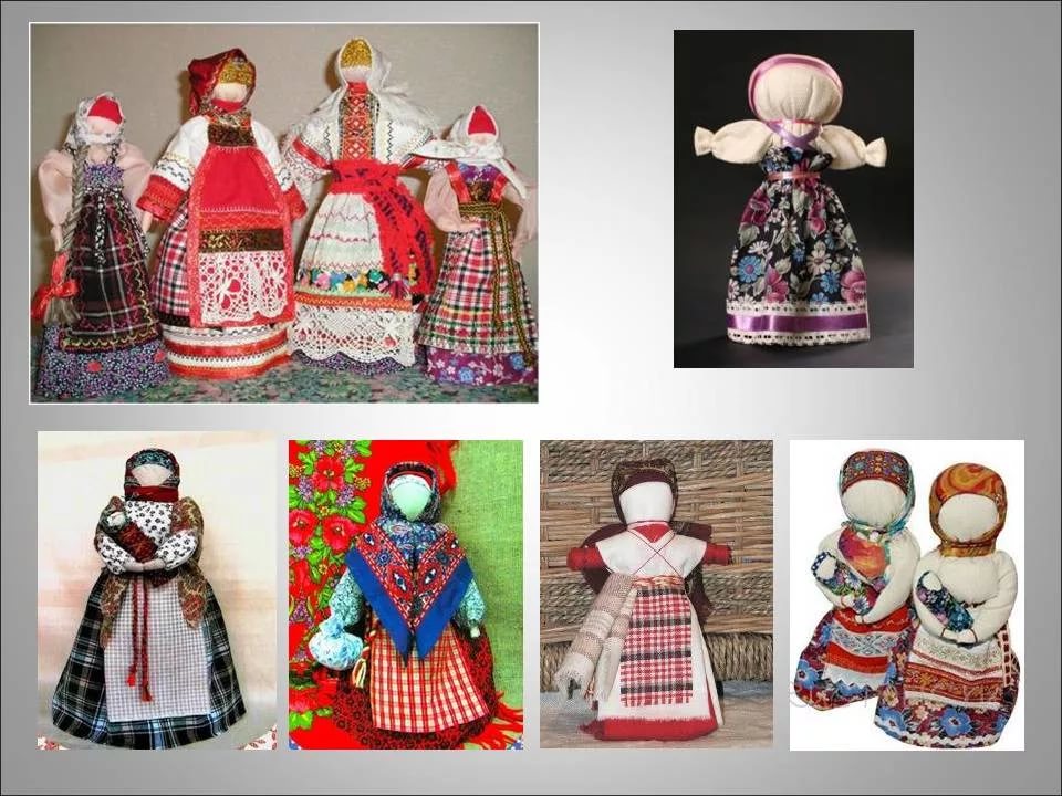 Славяне делали одновременно несколько видов кукол в одной категории. Например, только кукол-оберегов было 4-8 разновидностей, еще больше тех, что использовались при совершении различных обрядов и просто для игр. Игровые куколки должны были занять ребенка, пока родители работали или отдыхали, научить его выполнять отведенную ему обществом социальную роль.