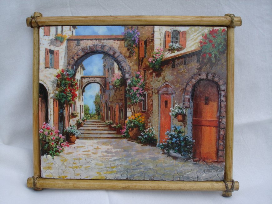 Части приклеивать на плотный картон, создавая выбранную композицию. Дать готовой работе просохнуть, поместить ее в рамку. Получилось настенное панно, которое по сюжету подойдет для кухни, детской, спальни, гостиной.