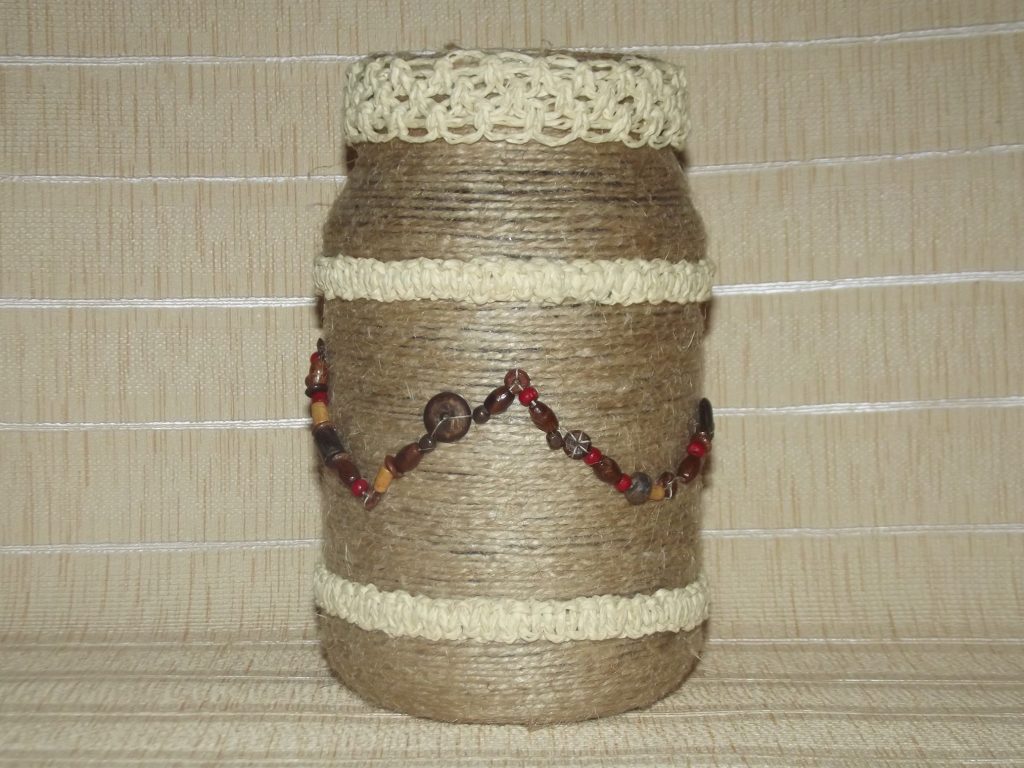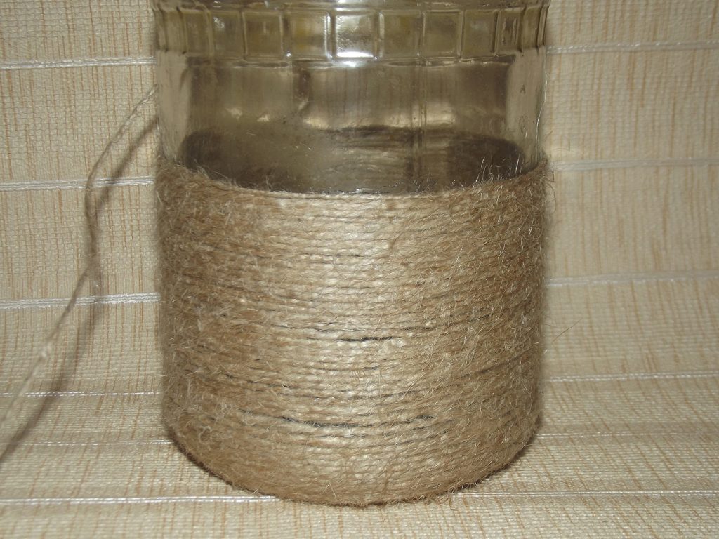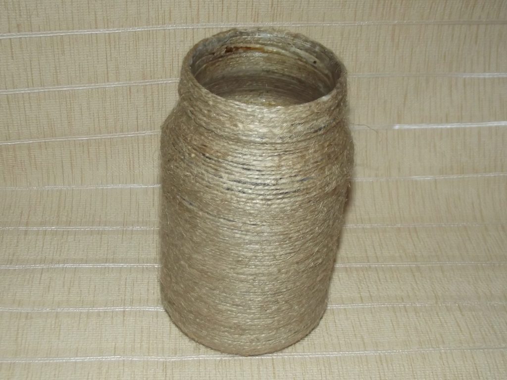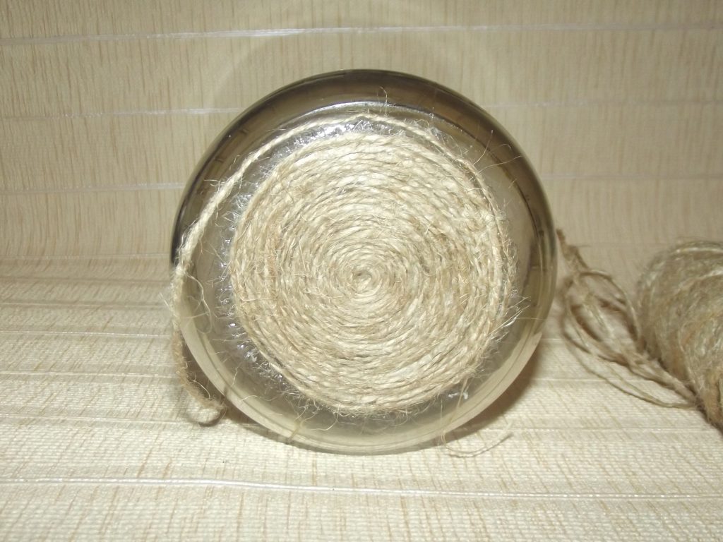 Стенки банки очень плотно обмотайте джутом, чтобы между нитями не было промежутков.