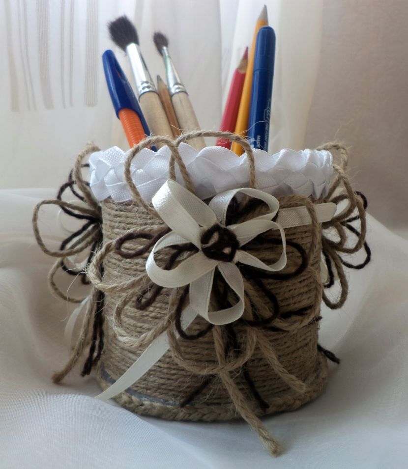 Особой популярностью пользуются поделки из джутового шпагата. Хотя он и обладает малой эластичностью, из него легко получаются плетеные и вязаные заготовки. Материал хорошо поддается окрашиванию и гармонично сочетается с другими материалами. Он обладает достаточной прочностью и износостойкостью, а самое главное — придает изделию натуральный вид.