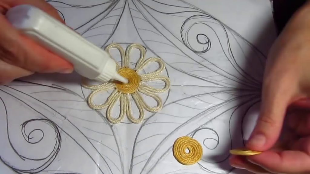 Из таких же материалов может изготавливаться цветок посредством формирования филиграни з джута. На листе распечатывается фигурный цветок, который потом укладывается в канцелярский файл. Смазав файл клеем, укладывать с помощью пинцета шпагат по контуру рисунка. Дополнительно все соединения и пересечения нитей нужно дополнительно склеивать.