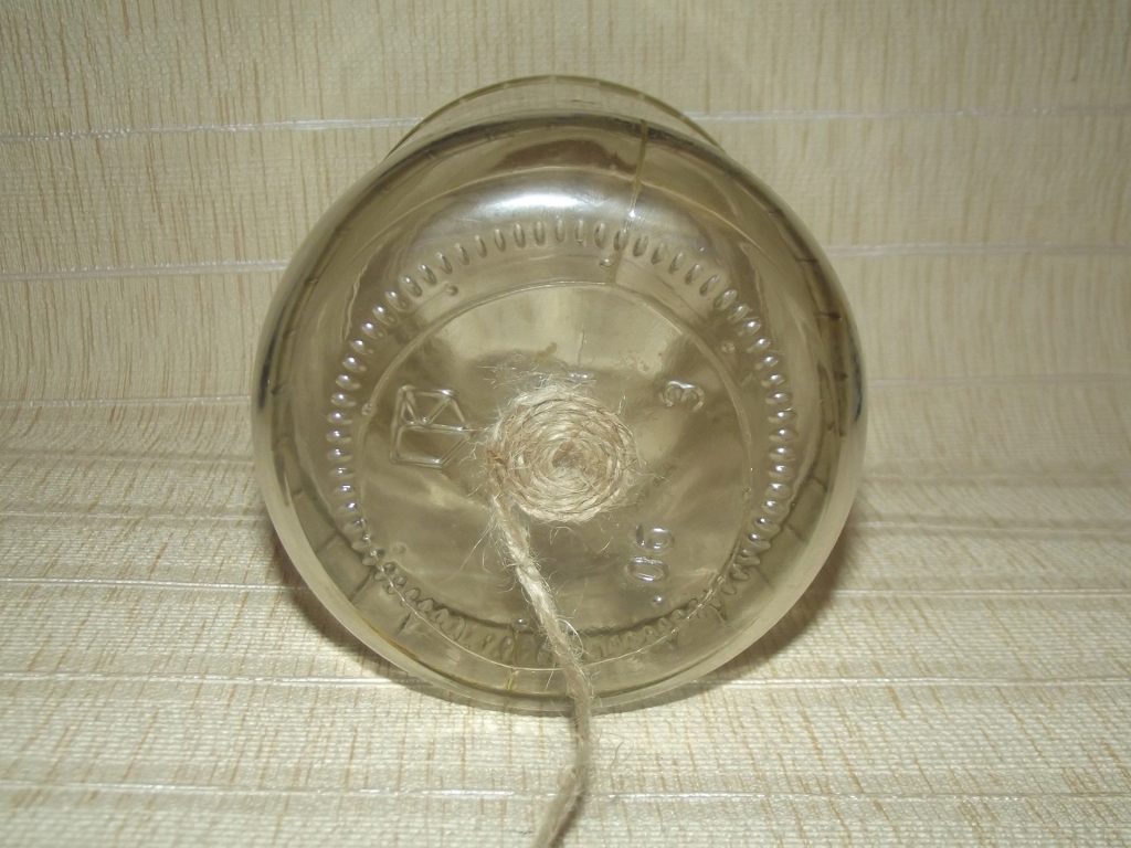 - далее можно приступать к плетению дна. Для этого дно пластиковой бутылки хорошо промазывается клеем. Затем с середины нужно начать выкладывать шпагат в виде плотной спирали, дать заготовке хорошо просохнуть;
