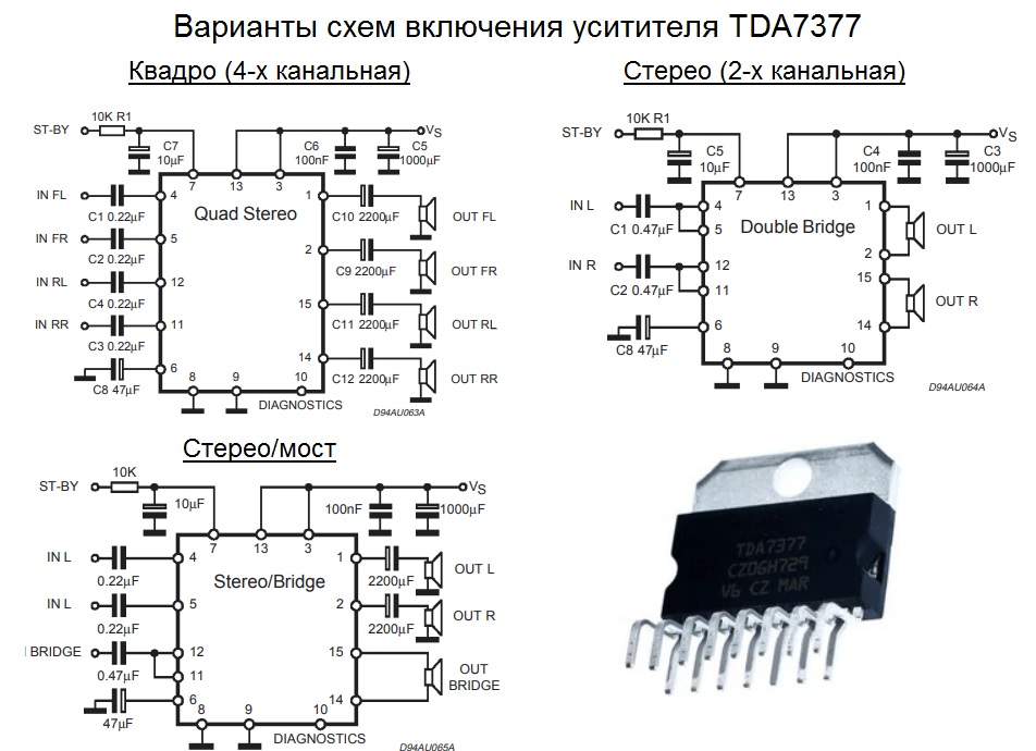 Для функционирования TDA7377 используется схема включения: в четырехканальном режиме (квадро), в двухканальном-мостовом или комплексном 2.1 (стерео/мост). Все они приводятся в datasheet с указанием необходимой электронной обвязки. Для работы микросхемы используется однополярное питание.