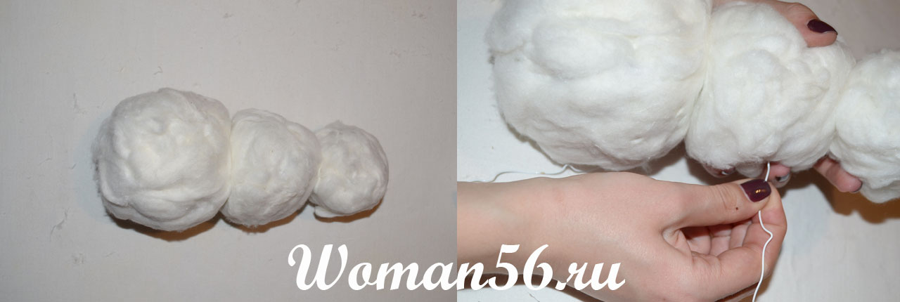 - Обложить полученную заготовку слоем ваты и плотно обмотать белыми нитками.