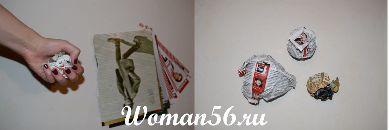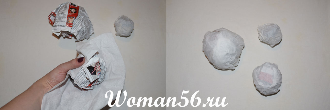 Формируем три шара разного размера по возрастанию, по такому же принципу, как и лепка снеговика из снега. Если вы использовали глянцевые журнальные листы, то тогда необходимо обвернуть шарики обыкновенной бумагой или салфетками.
