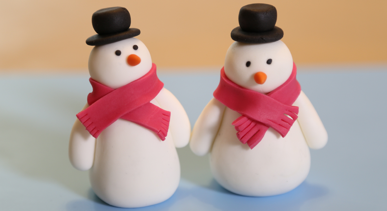 7. Прилепляем к снеговику ноги и руки, края присоединения притираем пальцами. А да, морковка! Её мы сделаем отдельно и приклеим уже после просушки, иначе она повиснет как крючок.