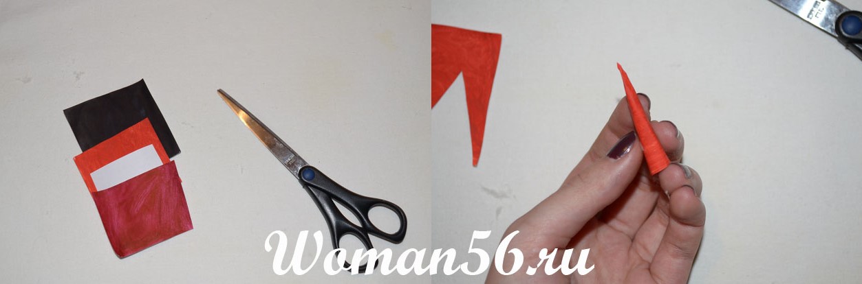 Затем прикрепляем заготовки к проволоке с помощью супер-клея. Приступаем к декорированию мордашки нашего снеговика. Для этого нам понадобится цветная бумага красного, черного, белого и оранжевого цветов.