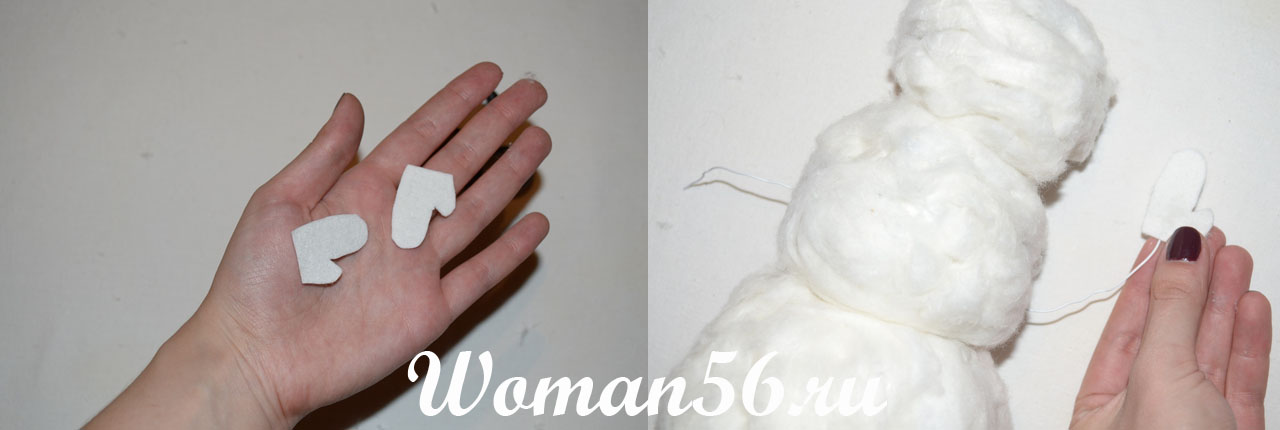 - Сформировать из влажной ваты руки и нос, покрыть клеем.