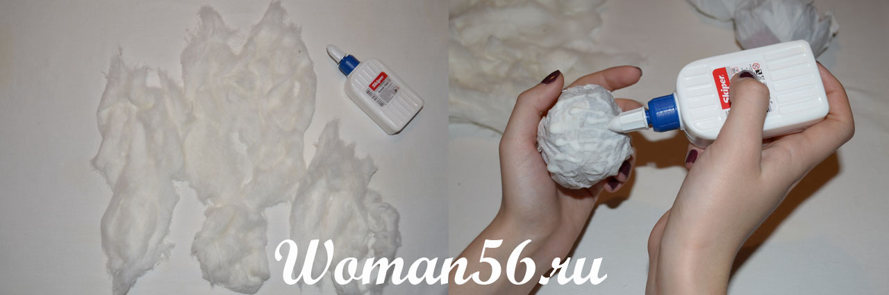 3. Обмазываем наши шарики клеем, прямо пальцами, все равно пачкаться. Кусочки ваты обмакиваем в клей и начинаем формировать тонкие пластины, равномерно распределяя клей. Промокшая вата, это очень податливый материал, поэтому заклеить ей все шарики не составит особого труда.