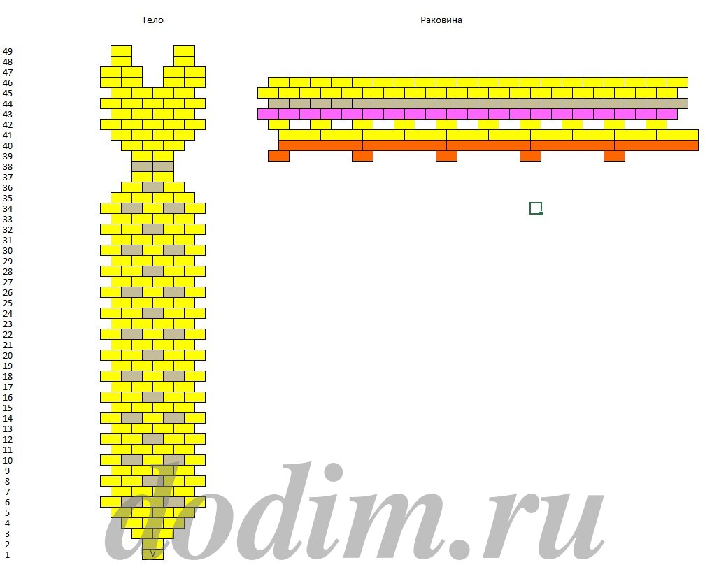 Перед сборкой изучите схему. Прямоугольниками обозначен каждый модуль. Слева есть нумерация рядов. На схеме изображено туловище и отдельно раковина. Цветовая гамма также указана.