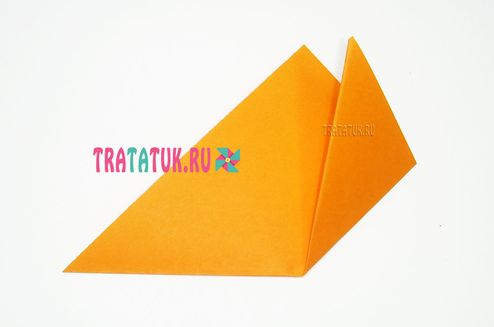 Сделайте сгиб, а затем сразу же направьте этот же уголок в сторону, делая подобие складочки, выравнивая его по правому сгибу треугольника.