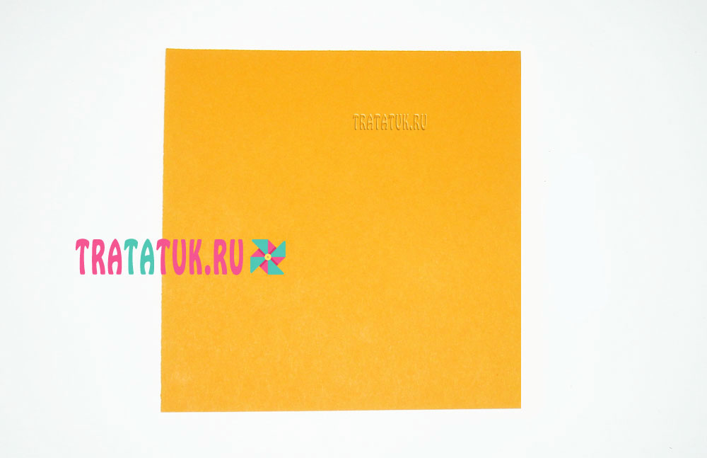 Приготовьте квадратный отрезок бумаги. Размеры – любые, в зависимости от возраста ребенка, так как им легче работать с большими деталями. Удобно использовать специальную оригами бумагу.