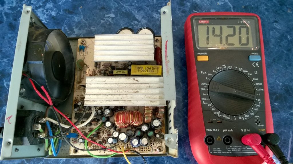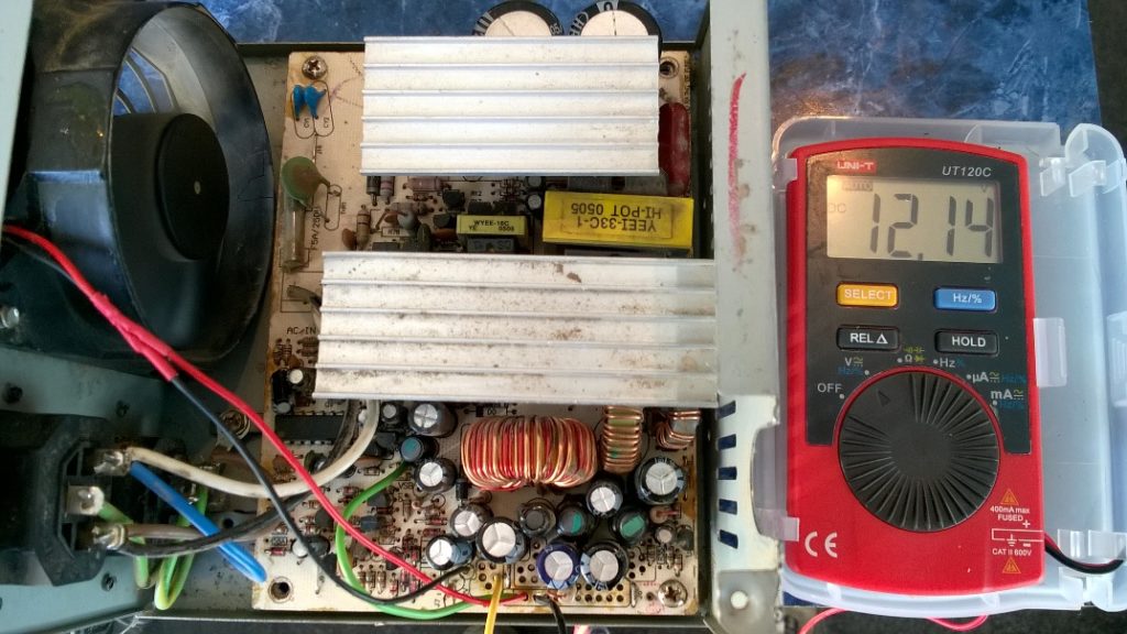 Финишным этапом будет поднятие напряжения до 14,0 В с помощью регулировки подстроечного резистора. Выше 14,0 В напряжение не стоит подымать на этом БП без дальнейших изменений схемы, т.к. уже при напряжении 14,2 В будут наблюдаться проблемы с запуском блока. А 14,0 В это вполне достаточно для зарядки автомобильного АКБ.