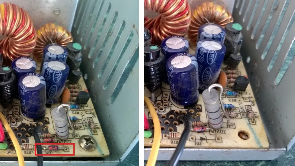 - Выполняется задача по снижению величины напряжения. Для этого потребуется найти резисторный элемент, расположенный на выходе. Нужна деталь, соединяющая шестой контакт схемы ТЕА1761 с положительным выводом блока питания. Этот резисторный элемент следует выпаять при помощи паяльника и произвести замер его сопротивления. Рабочий параметр составляет 18 кОм.