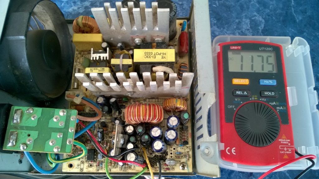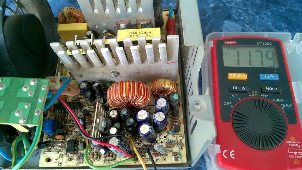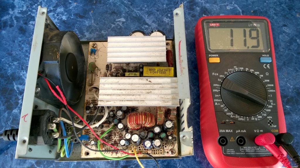 Запускаем блок питания. На выходе напряжение должно быть почти 12 В.
